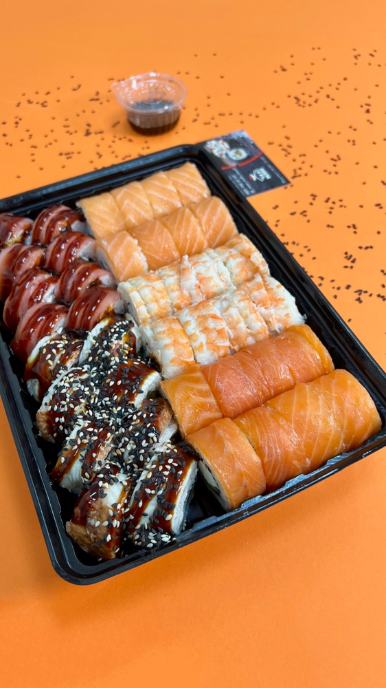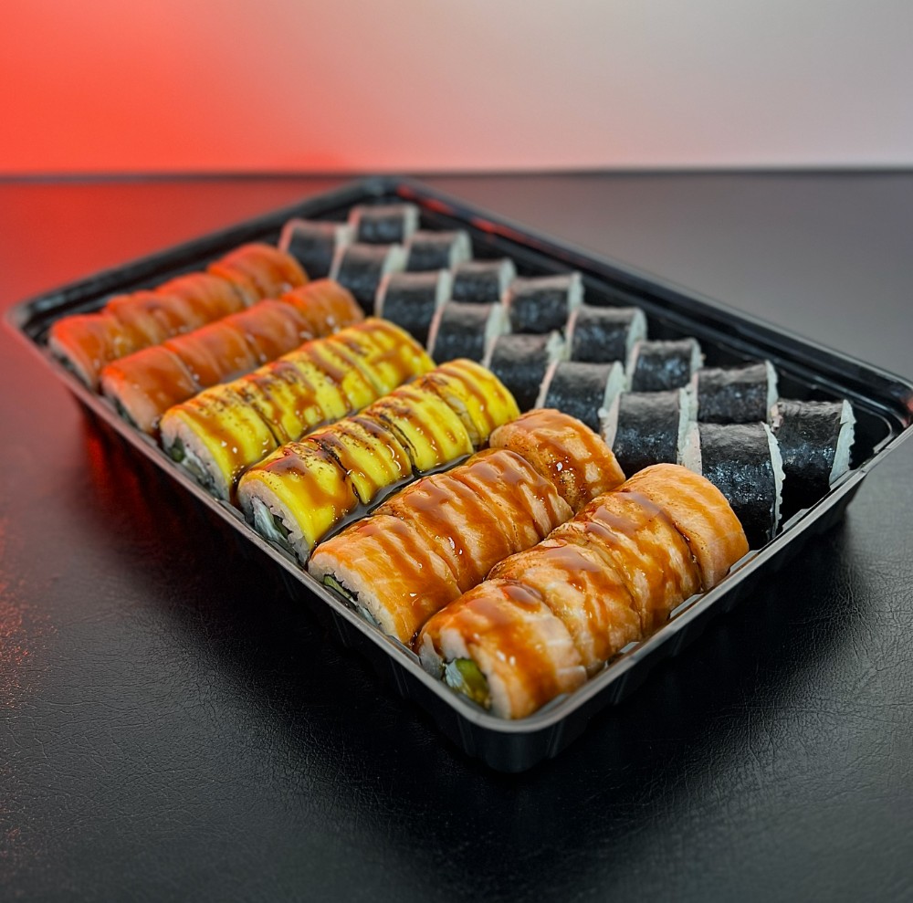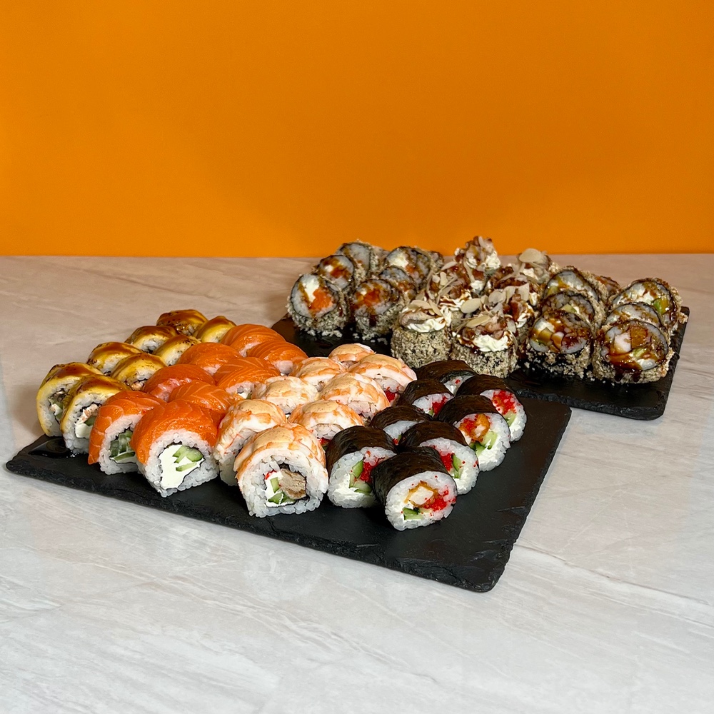 Філадельфія з лососемЧіз рол з печеним лососемФірмовий рол СамурайФутомак з куркою панкоМіто темпура з копченою куркоюМіто лососьБанзай з вугремЧас приготування 1 година!
