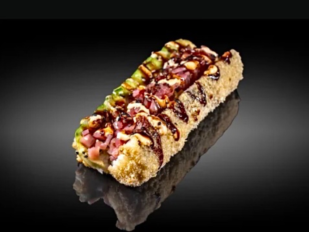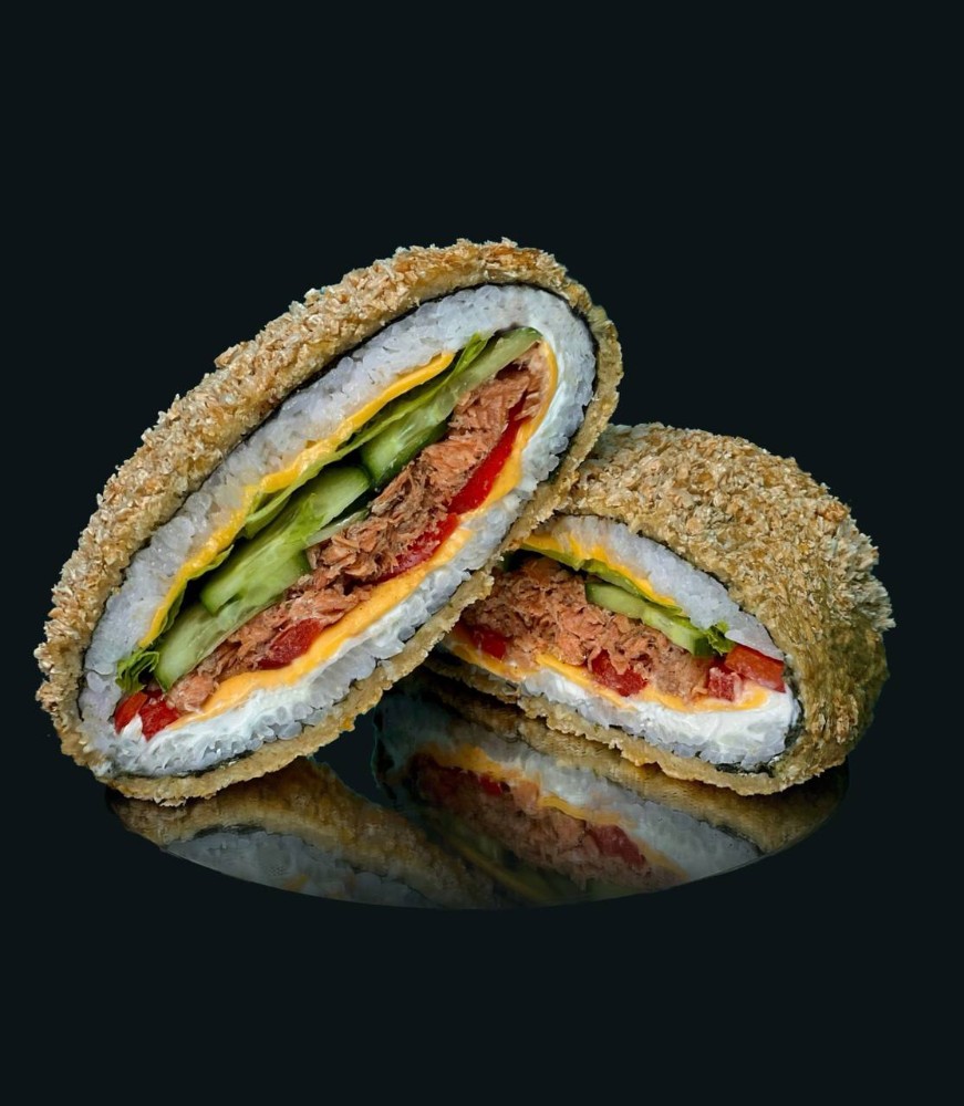 Склад: рис, листя норі, тунець, ікра масаго, авокадо, салат айсберг та крем-сир філадельфія.Бургер поливається соусами унагі та спайсі.
