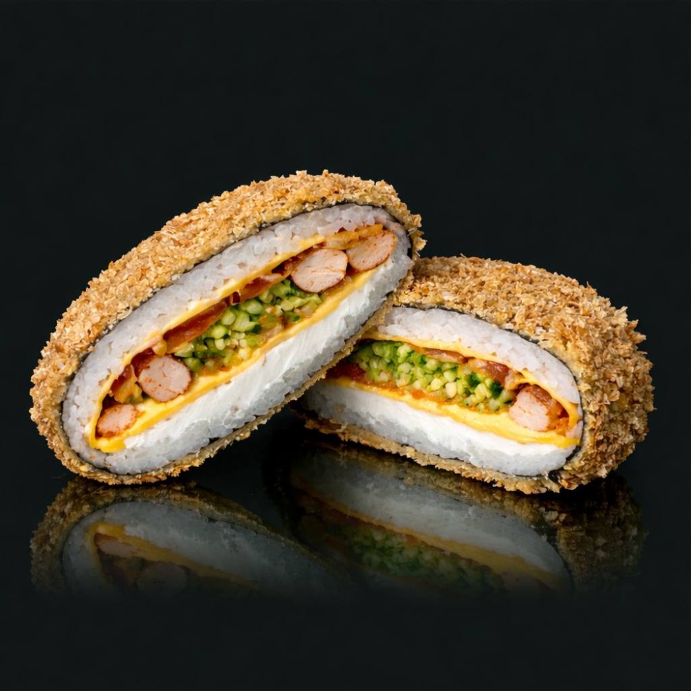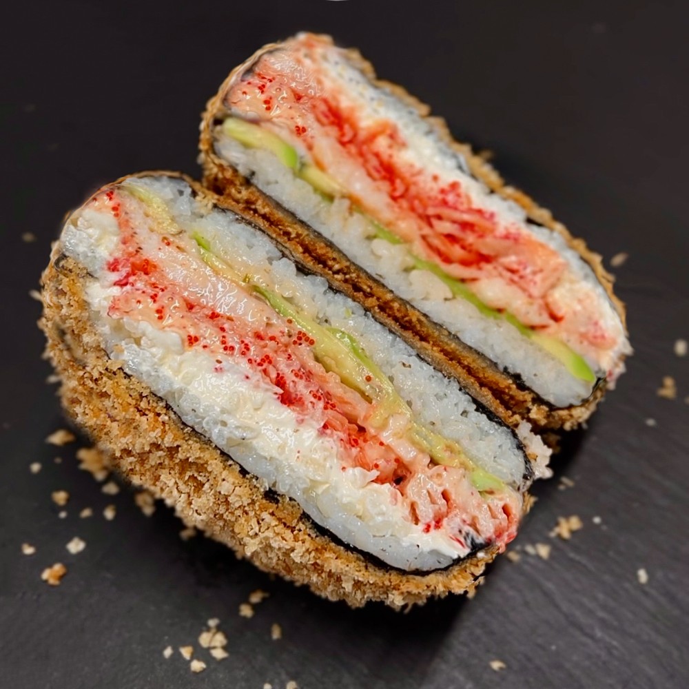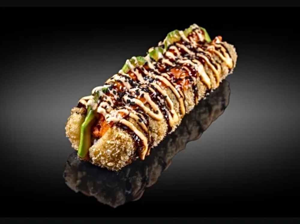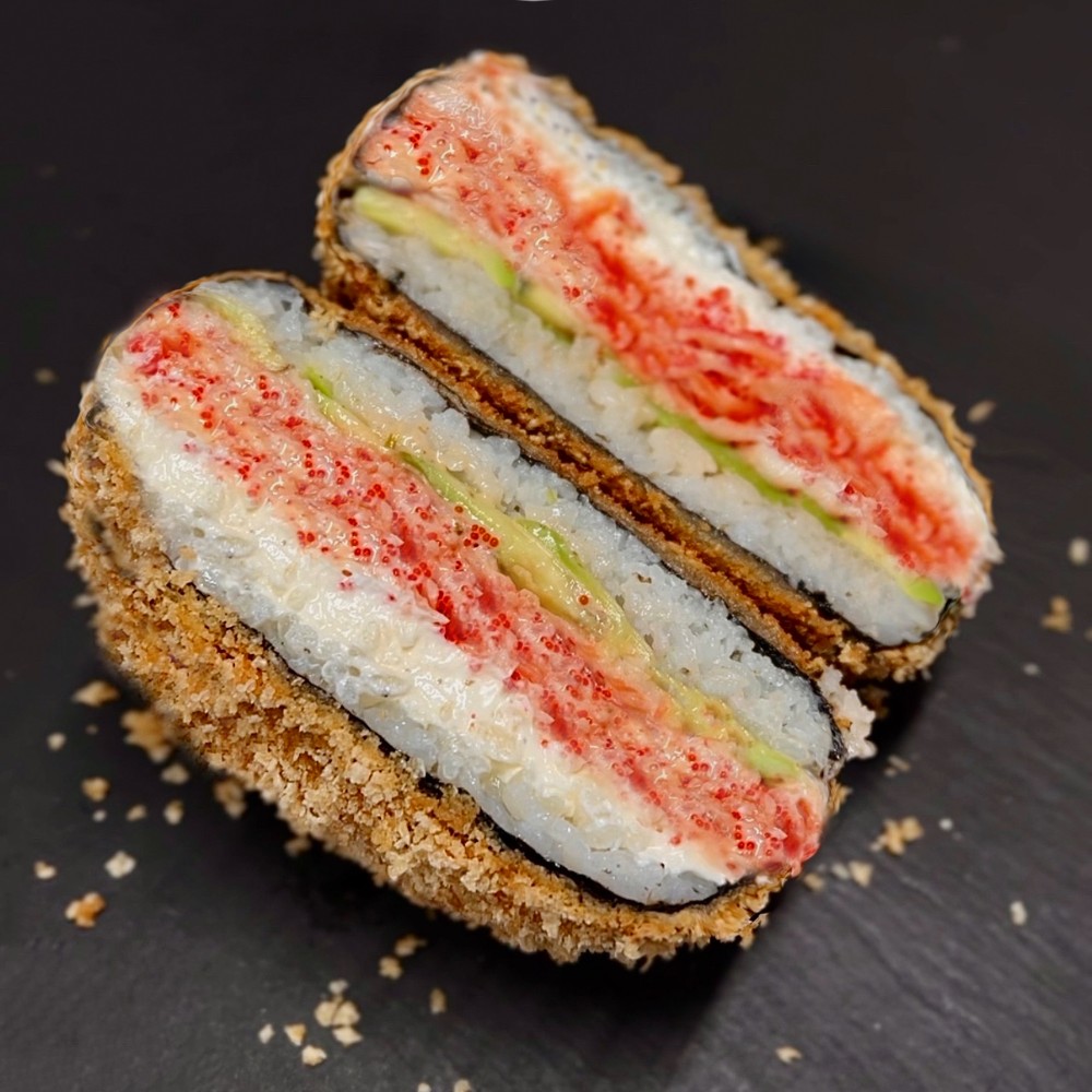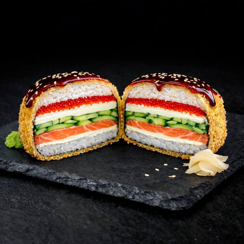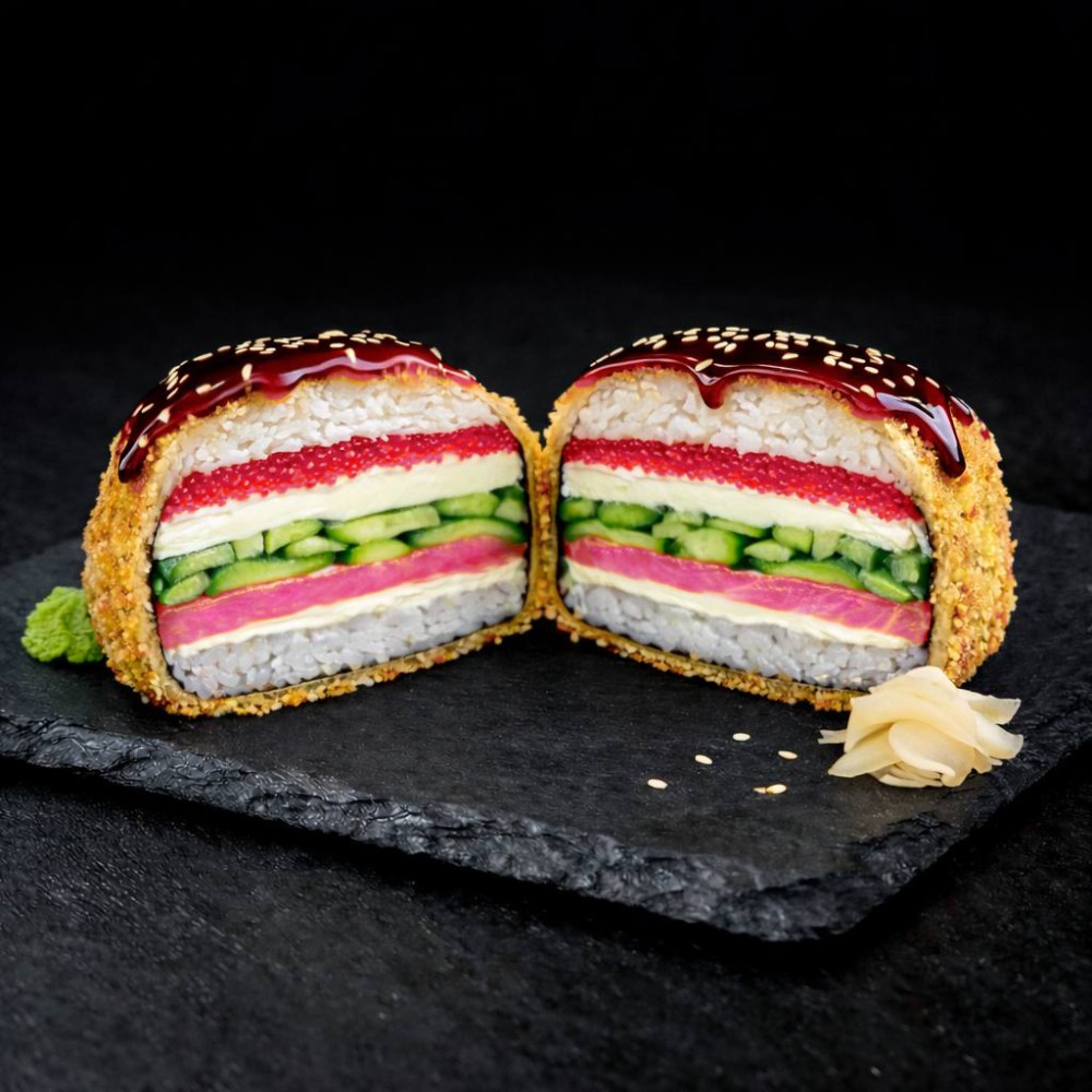 Склад: рис, листя норі, мікс сурімі, соус спайсі, ікра масаго, авокадо та крем-сир філадельфія.Бургер поливається соусами унагі та спайсі.За Вашим бажанням можемо зробити з чорним рисом +20грн.