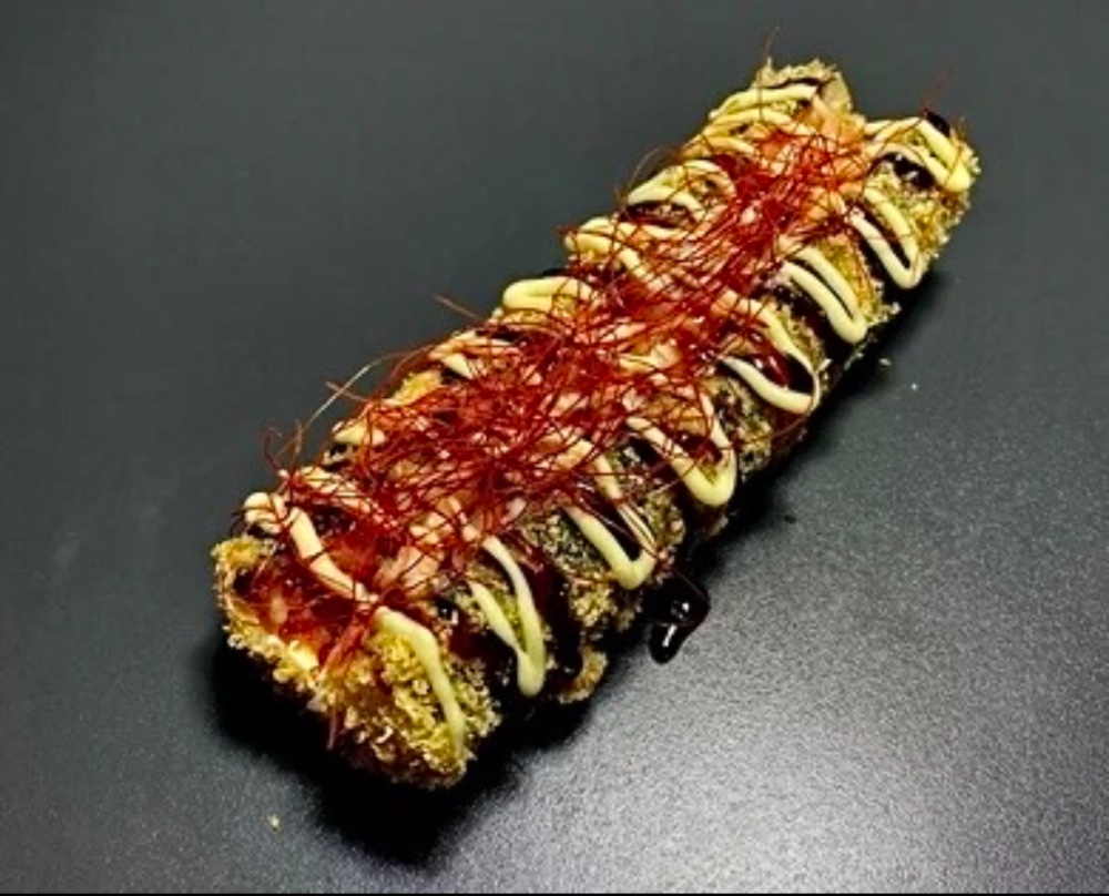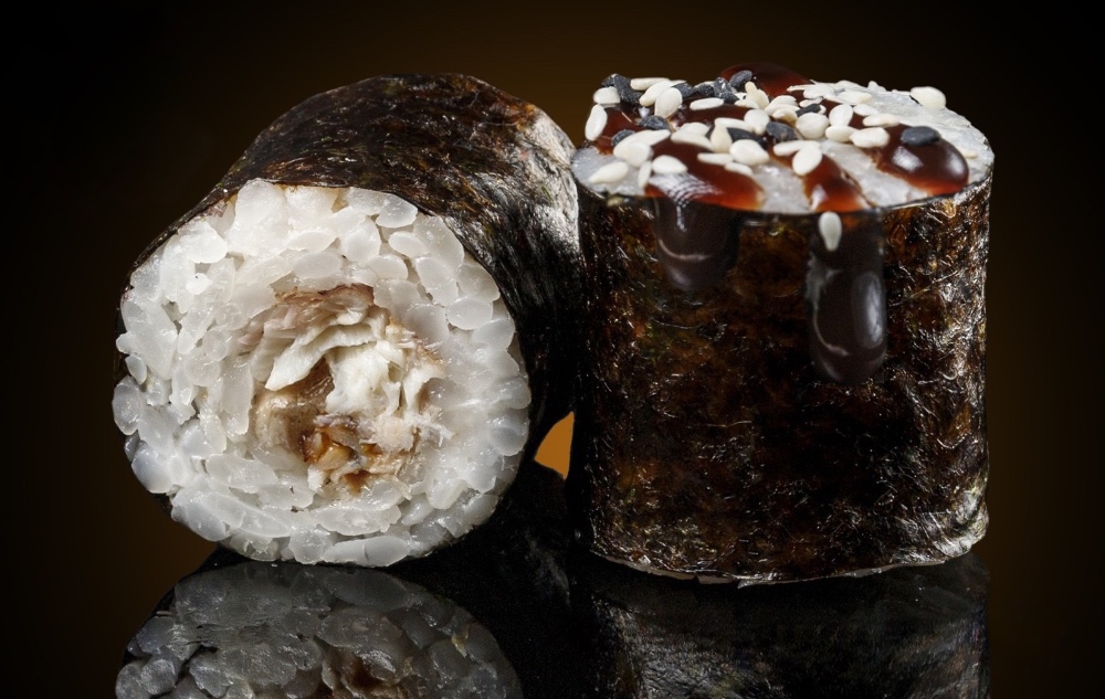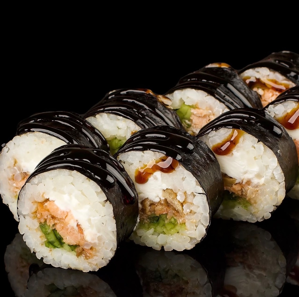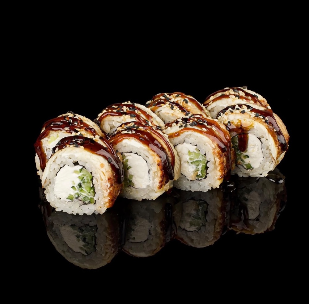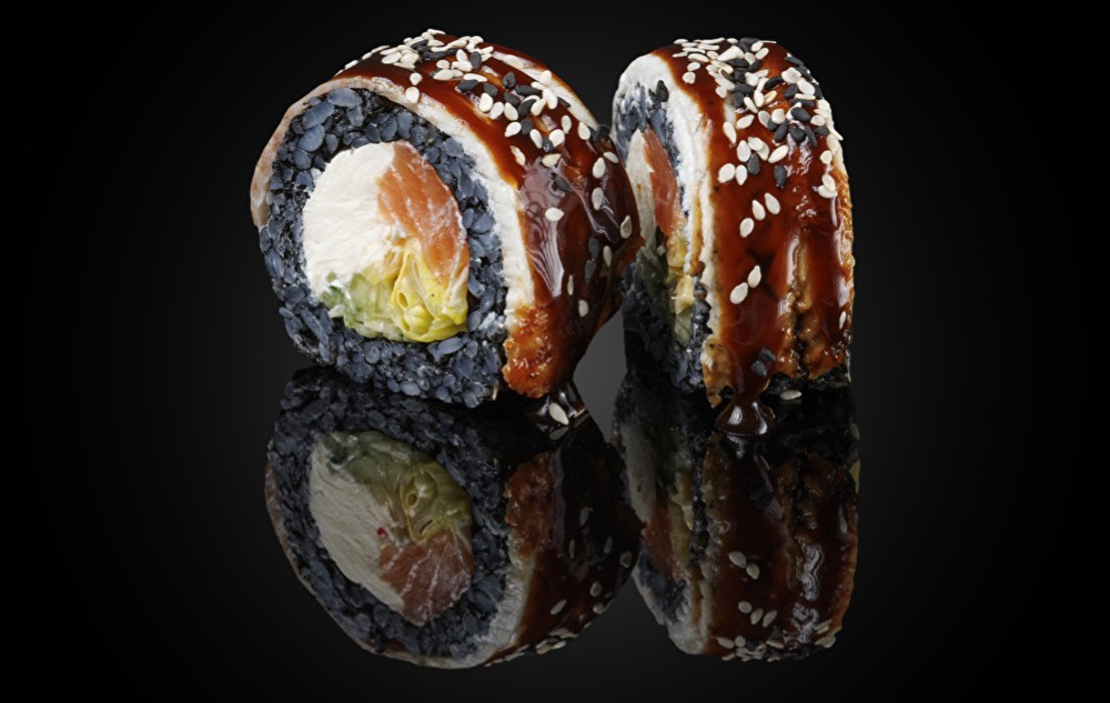 Склад: рис, листя норі, вугор, омлет томаго, авокадо та крем-сир філадельфія.Бургер поливається соусами унагі та спайсі.За Вашим бажанням можемо зробити з чорним рисом +20грн.