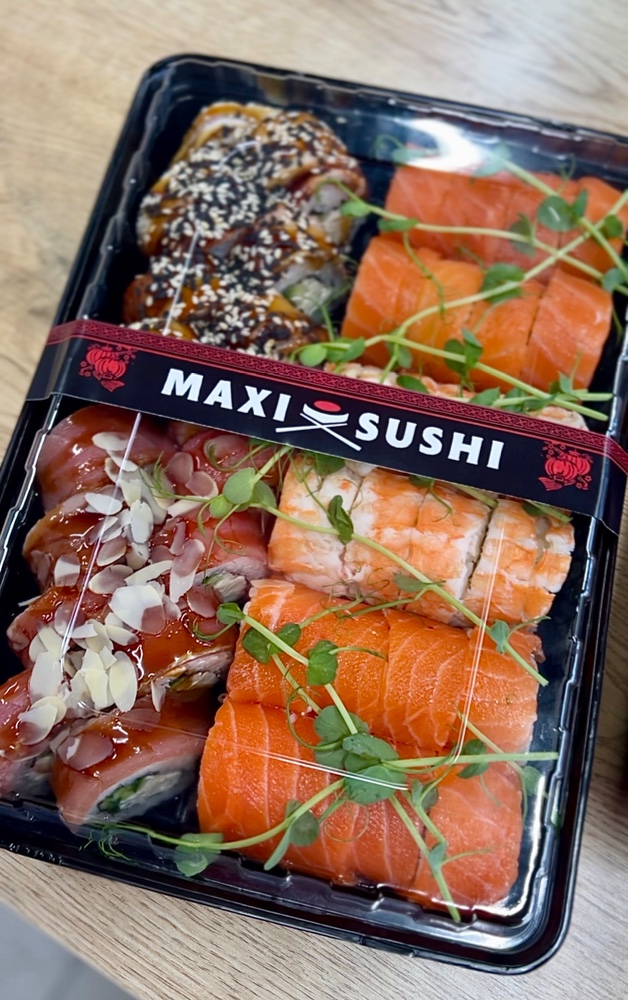 Склад: рис, листя норі, форель, ікра масаго, авокадо, салат айсберг та крем-сир філадельфія.Бургер поливається соусами унагі та спайсі.За Вашим бажанням можемо зробити з чорним рисом +20грн.