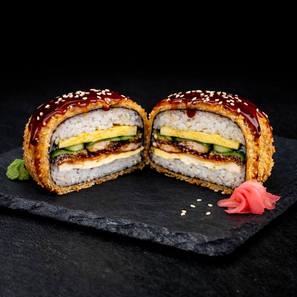 Склад: рис, листя норі, куряче філе, огірок, сир чеддер та крем-сир філадельфія. Бургер поливається соусами унагі.